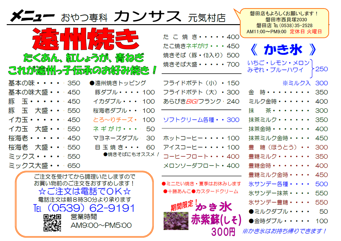 ハンバーガーやたこ焼き、かき氷なら磐田市のおやつ専科カンサス